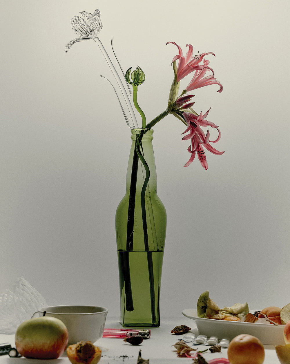 Abgesehen von Zigarettenstummeln und Pillen erinnert die Atmosphäre an die alten Vanitas-Stillleben vergangener Jahrhunderte.