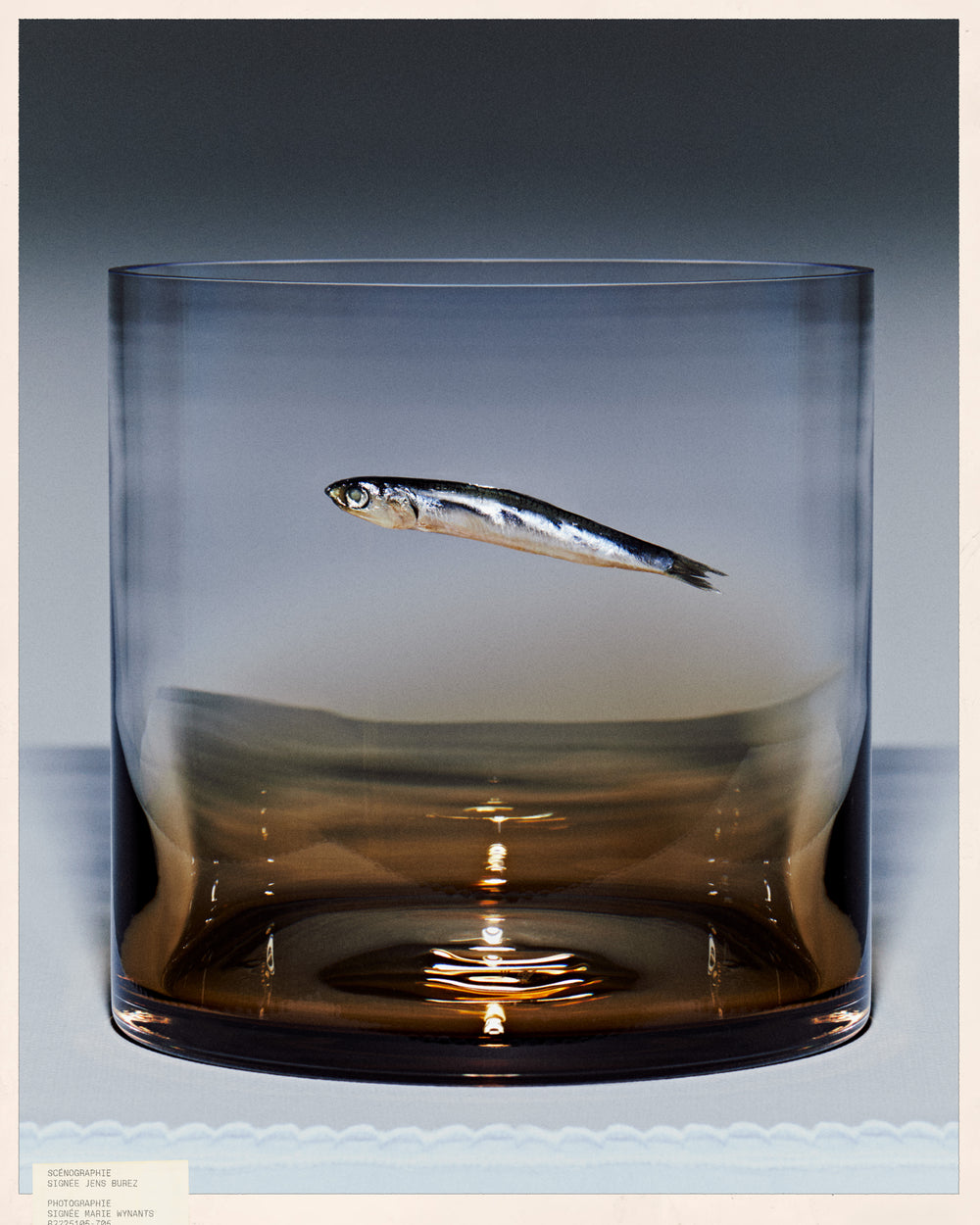 Marie: „Wir kommen immer sehr gut vorbereitet. Jens Burez (Setdesign) und Sabato Amsterdam (Foodstyling) – zwei meiner regelmäßigen Kollaborateure – haben ein unglaubliches Gespür für Textur und Farbe. Obwohl wir vieles im Voraus planen, lassen wir am Set auch Raum für spontane Magie. Dieser kleine Fisch war einfach da, wartend, und plötzlich landete er in der Vase. Es fühlte sich einfach richtig an.“