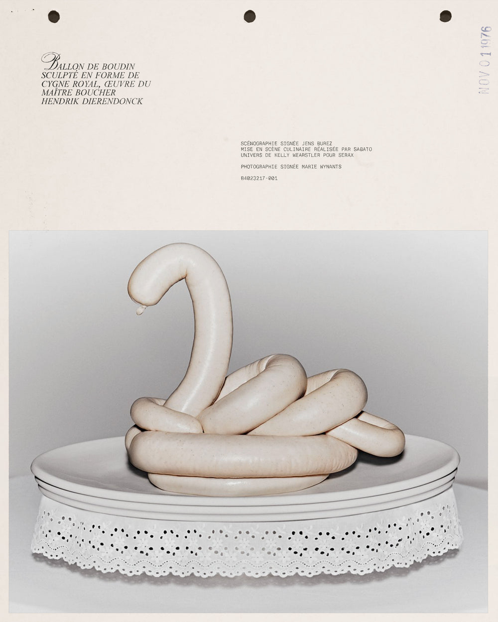 Marie: „Der Wurstschwan ist eigentlich eines meiner Lieblingsbilder aus dem Shooting – eine Art Hommage an die Absurdität. Die Idee kam mir, als ich in einer Metzgerei stand. Ich bin besessen von der theatralischen Stimmung, die man dort findet: glänzende Pasteten, retro Preisschilder, hängende Würste … Von dort aus kamen wir auf die Idee der Luftballontiere bei Kinderfesten und fragten uns – was wäre, wenn wir eines aus einer weißen Wurst machen würden? Belgiens berühmtester Metzger, Hendrik Dierendonck, hat ihn für uns spontan geformt. Ich meine – wer sonst hätte das hingekriegt? Und ja – wir haben den Schwan danach gegessen!“