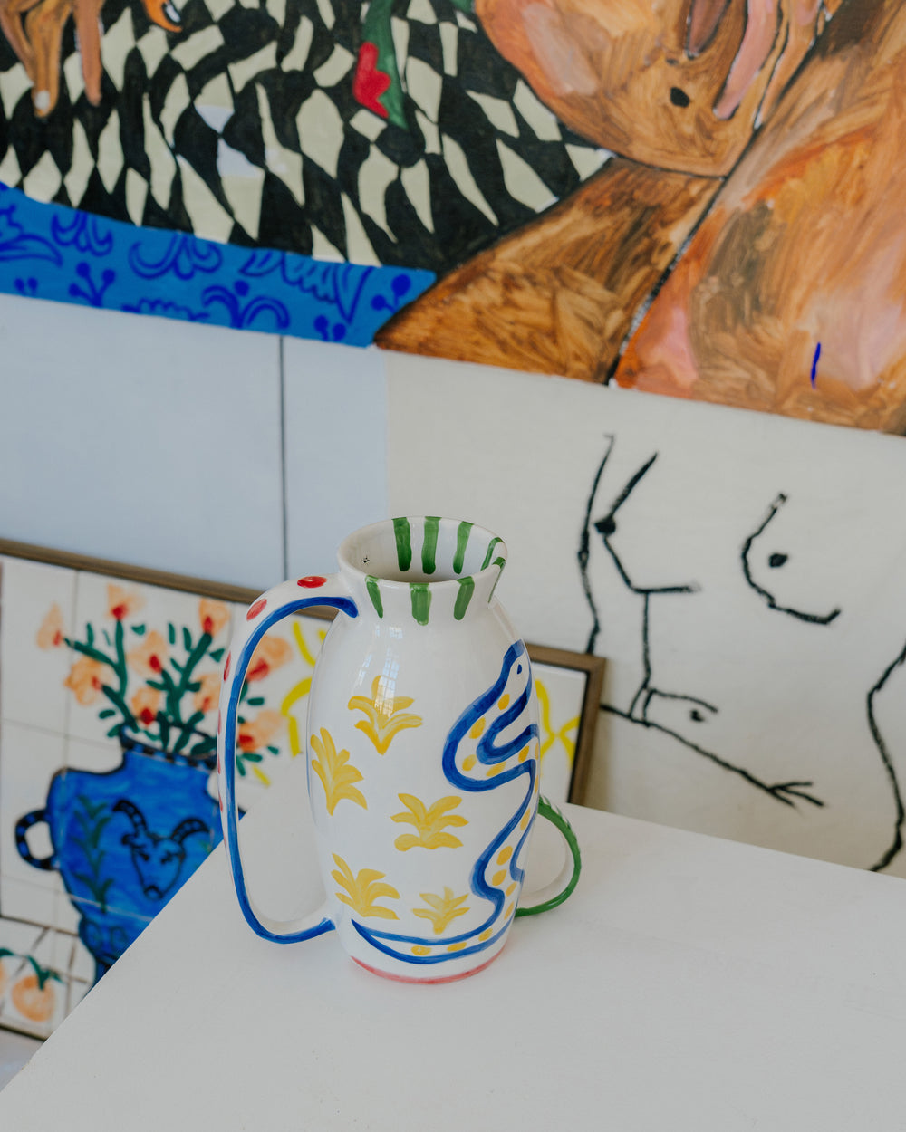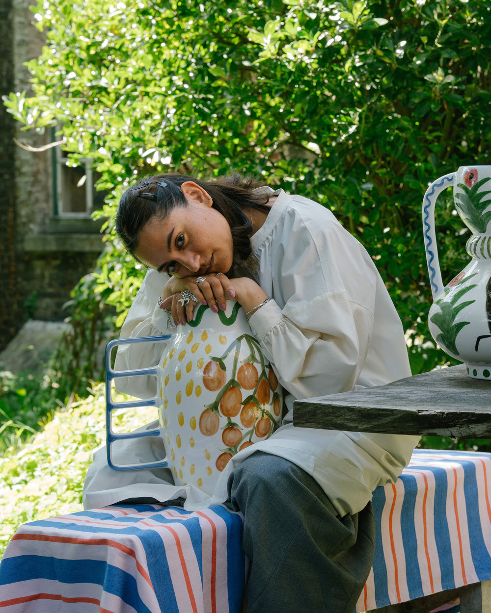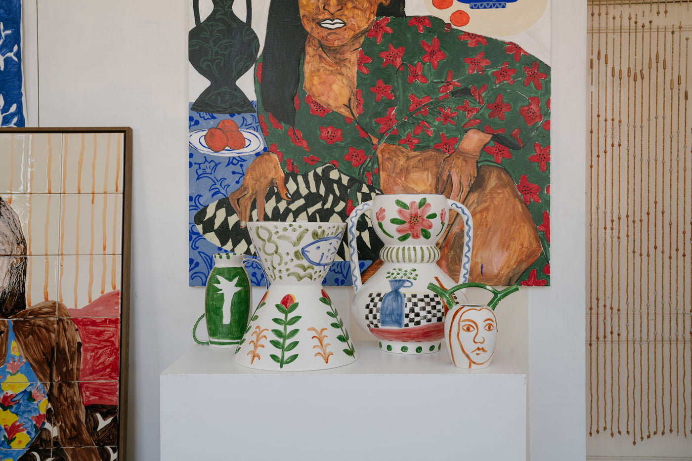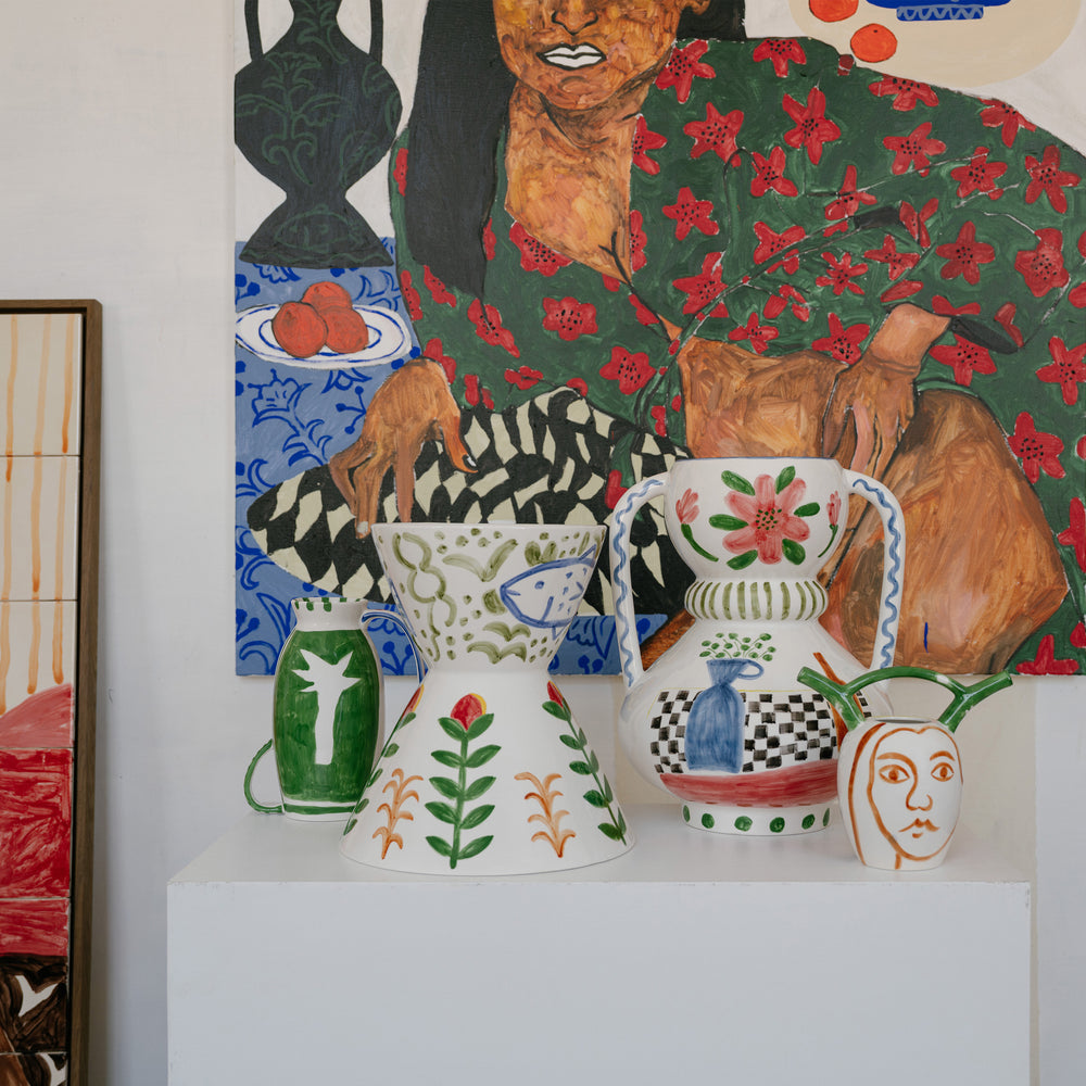 L’atelier ha un aspetto domestico, e non sorprende. Shirley dipinge ritratti di amici e conoscenti e, nei suoi quadri, crea attorno ai soggetti una ricchezza di oggetti casalinghi, dalle piante da appartamento alla ceramica. «Le piante sono indispensabili per me, perché rappresentano il mio legame con la foresta amazzonica», spiega. «Il resto proviene dai miei viaggi. Dal Giappone porto spesso ceramiche, dal Marocco piastrelle, e nei mercatini delle pulci di Parigi vado a caccia di curiosità.» Questi oggetti ispirano la ceramica fantasiosa dei suoi dipinti. Insieme a Serax, e su richiesta della sua gallerista Sofie Van de Velde, Shirley ha dato vita a questi vasi uno per uno. Così il cerchio si chiude.