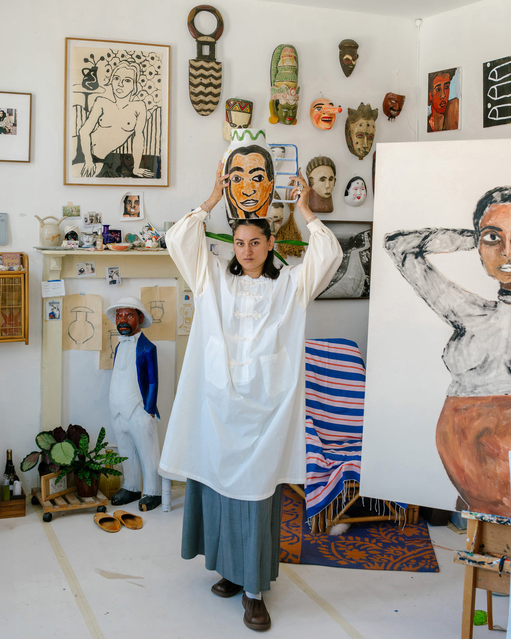 Shirley è appena tornata da New York, dove ha esposto insieme alla sua gallerista Sofie Van de Velde alla leggendaria fiera d’arte The Armory Show. Il suo spazio di lavoro si trova a Gand. «È un piccolo e accogliente atelier dove sono appese le numerose curiosità che raccolgo durante i miei viaggi», racconta Shirley. «Per me è molto importante trarre ispirazione quando viaggio. La mia collezione di maschere africane, ad esempio, significa molto per me. L’influenza dell’arte africana su quella europea non va sottovalutata.»