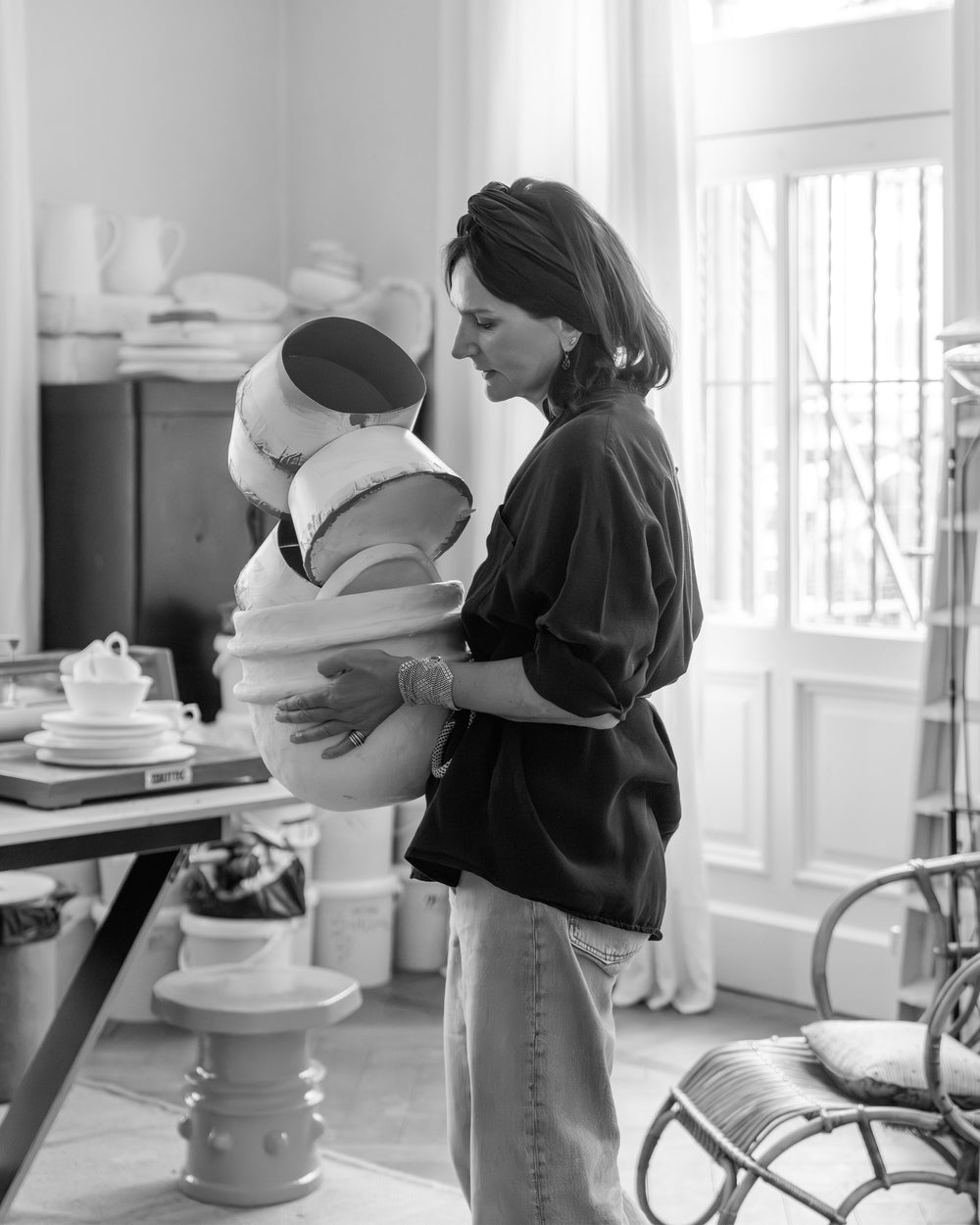 Tra i suoi contributi più iconici all’universo Serax ci sono tre collezioni molto diverse ma ugualmente espressive. Pawn è una serie scultorea di tavolini con silhouette geometriche che fungono anche da sgabelli, ed è giocosa, modulare e piena di personalità. La sua collezione Lighting spazia da luci ambientali a pezzi di grande impatto, realizzati a mano in ceramica e cartapesta con una forte presenza architettonica. Infine, La Mère, la sua linea di stoviglie, rende omaggio alla figura materna (nonna) con forme modellate a mano, smalti nostalgici e ritratti femminili dipinti.