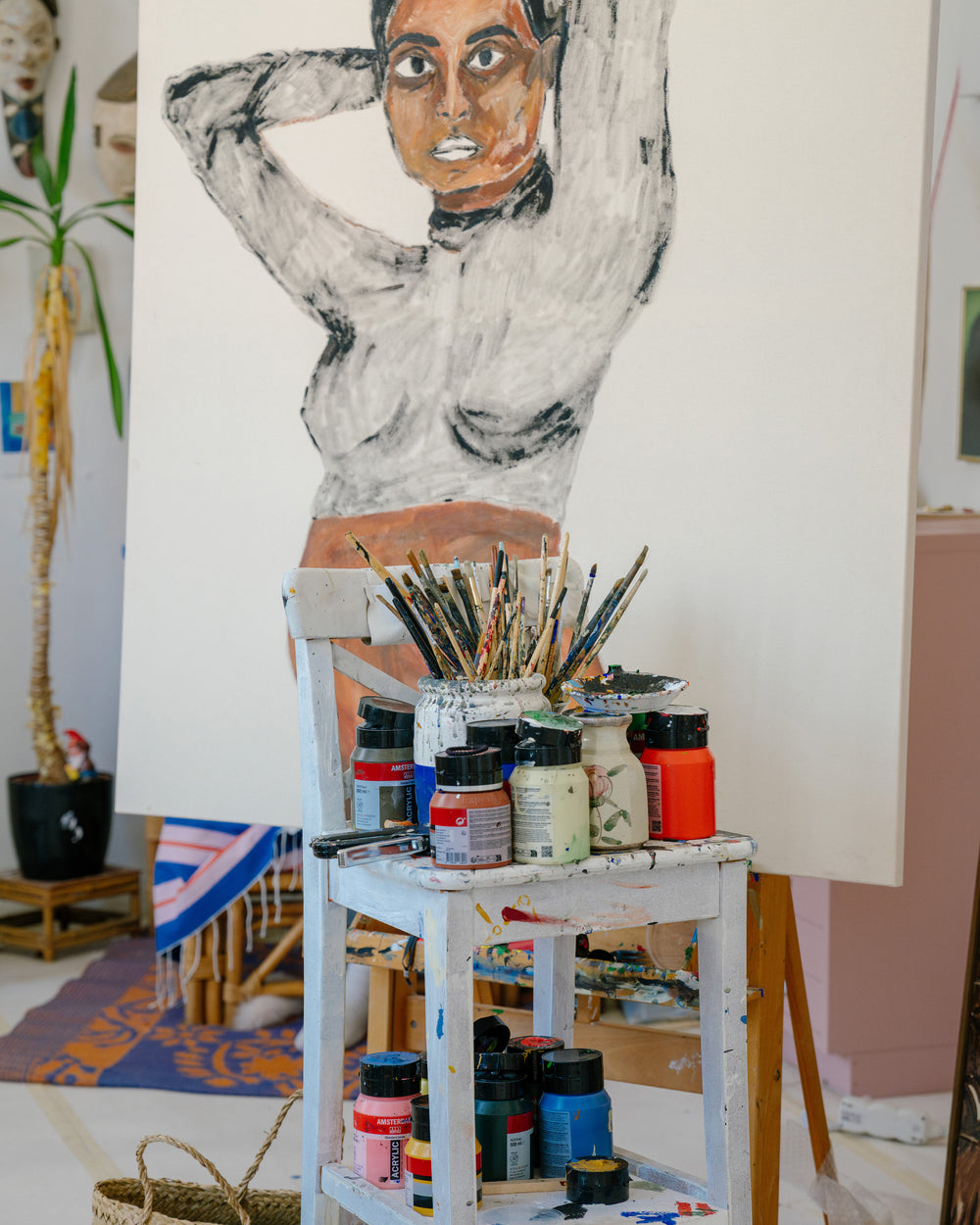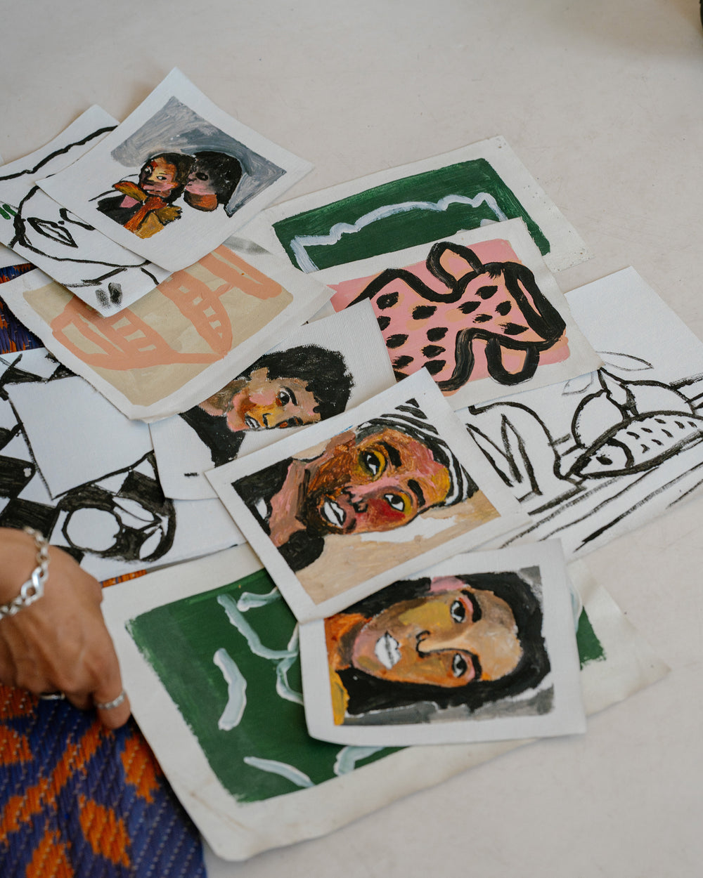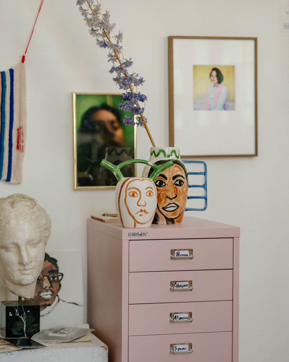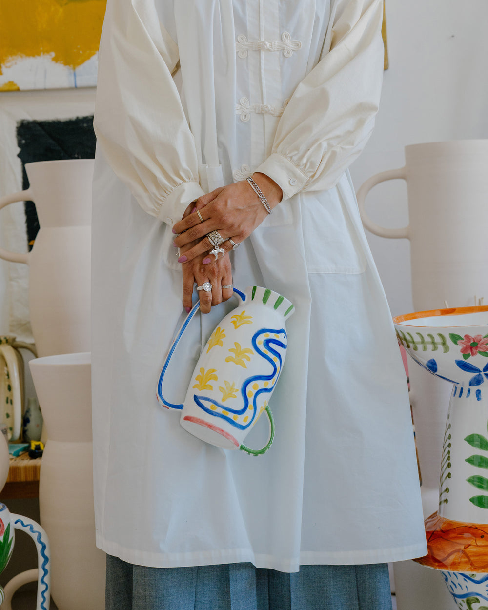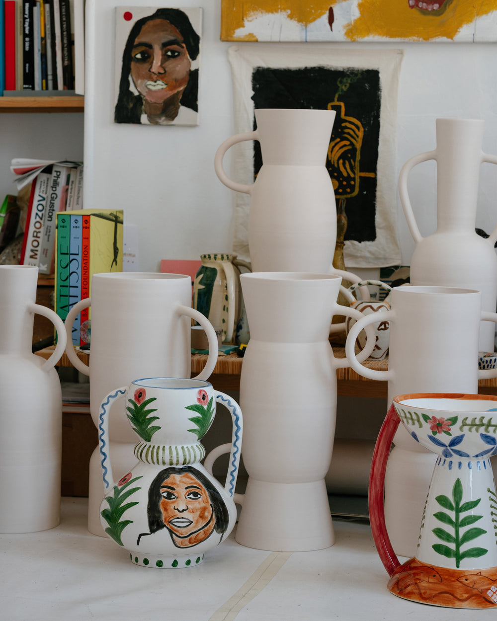 Il successo di Shirley è strettamente legato al suo stile distintamente contemporaneo e personale. Dipinge principalmente ritratti di famiglia, amici e conoscenti in modo crudo e colorato. La prospettiva viene gettata dalla finestra, le linee di contorno nere sono applicate con audacia e la tavolozza moderna dei colori consiste in grandi superfici ruvide. Attraverso questo, Shirley cattura perfettamente lo spirito dei tempi. In un'epoca di iper-tecnologia e IA, le persone desiderano purezza, naturalezza e umanità. Ora, questo giovane talento, insieme a Serax, presenta una collezione unica di ceramiche dipinte a mano che dà vita alla ceramica dei suoi dipinti: Santiago de Borja.