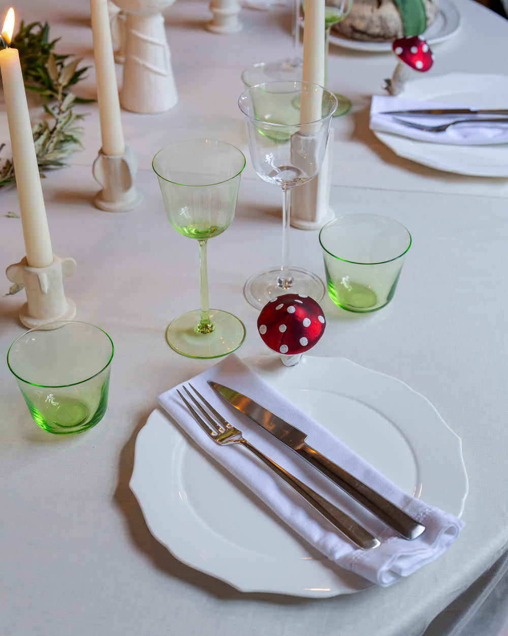 “Ik hou ervan om de zilveren kandelaars van mijn grootmoeder te combineren met enkele exemplaren van Serax — een mix die tegelijk nostalgisch en eigentijds aanvoelt,” vertelt Marie. “Ze passen prachtig bij katoenen servetten, die ik bind met een lint voor een extra feestelijke sfeer.” Dit jaar dekt ze de tafel met het nieuwe witte servies van Sergio Herman, genaamd Silhouette: tijdloos en klassiek, maar met een moderne twist. “Perfect voor de feestdagen. Ik speel ook graag met glaswerk en maak een kleine drankhoek waar verschillende stijlen glazen samenkomen, van speels tot verfijnd.”
