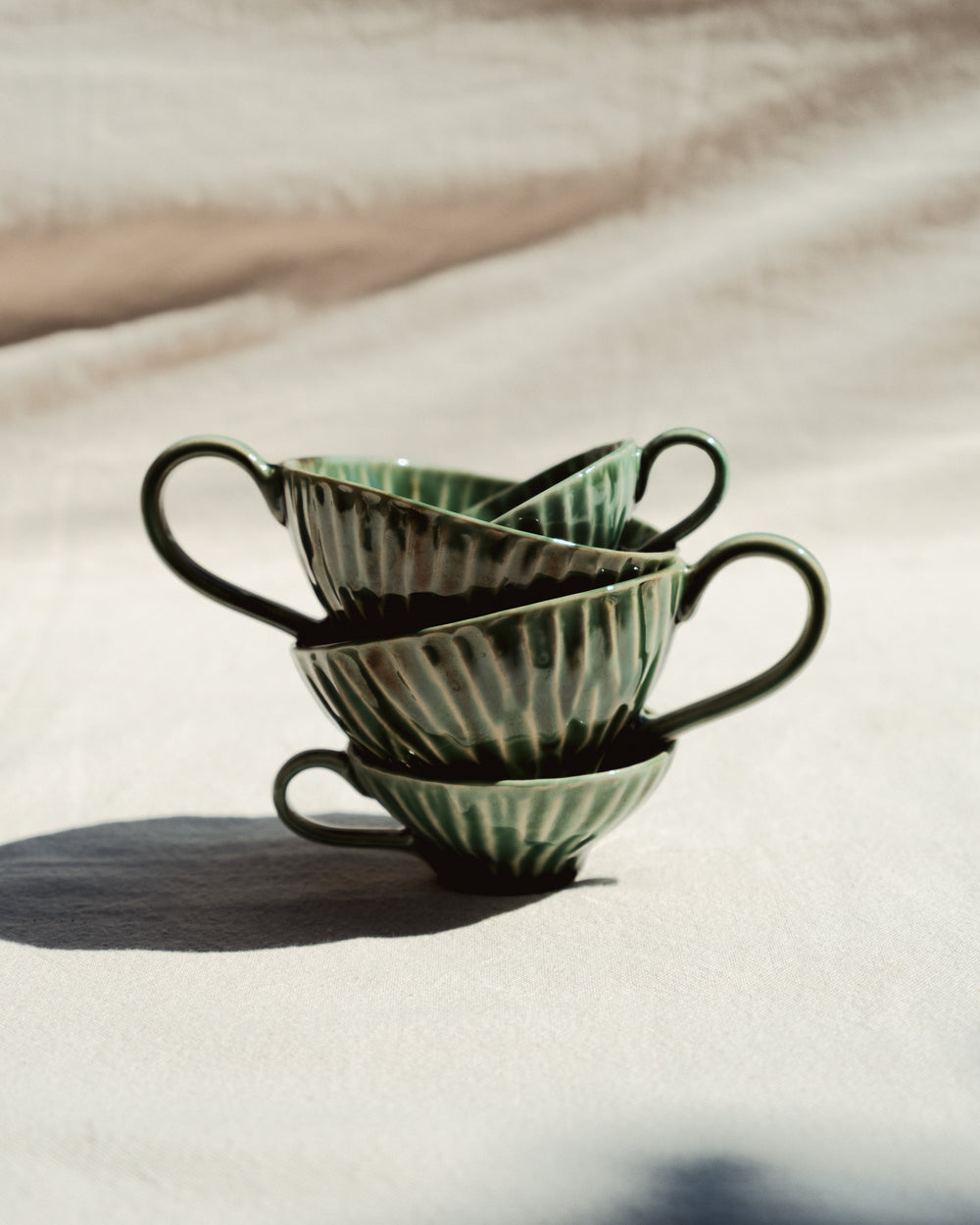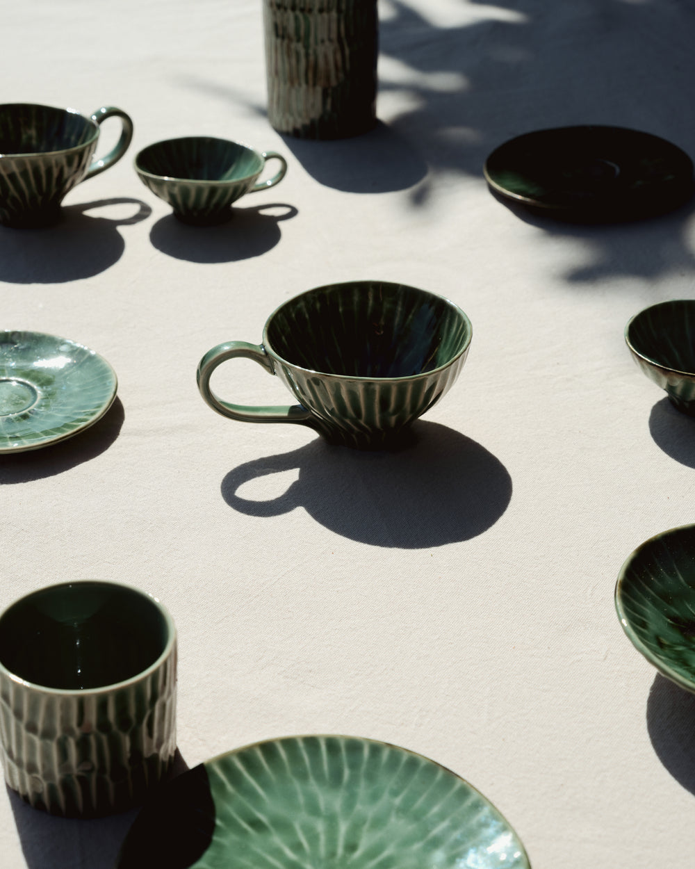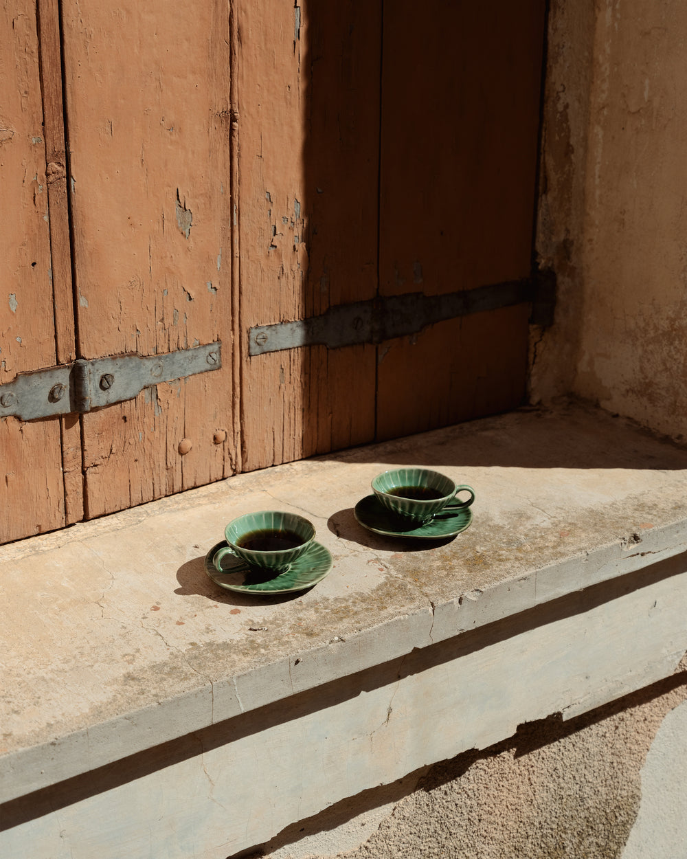 Pascale Naessens gelooft in de kracht van de natuur, toevalligheden en vakmanschap. De kenmerkende schelpachtige textuur van de borden creëerde ze door haar vinger op een specifieke manier in de klei te drukken. Dit handgemaakte detail geeft het servies zijn persoonlijke en unieke karakter. “Geen twee stukken zijn hetzelfde.” Met Verde Lanza brengt ze die eilandenergie rechtstreeks naar de tafel en verandert ze elk ontbijt, elke lunch of elk diner in een klein vakantietafereel.