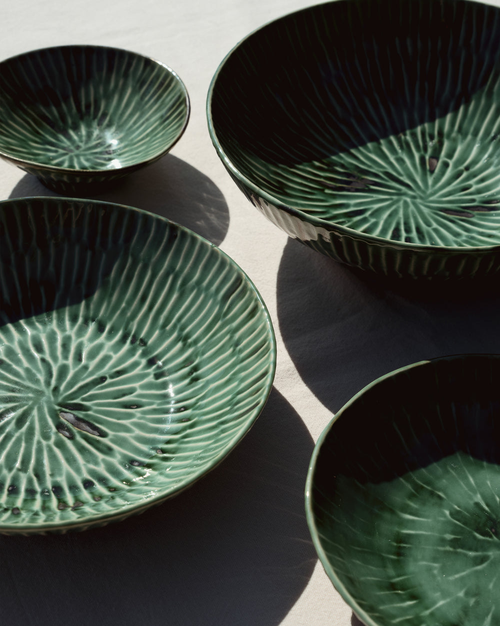 Tijdens het schrijven van haar nieuwste kookboek "Eén Pan" voelde Pascale Naessens de drang om terug te keren naar haar keramiekatelier. Daar ontstond een nieuwe serviescollectie: Verde Lanza. De zongeverweerde groene glazuur en schelpachtige textuur van de stukken roepen een van haar favoriete eilanden op: Lanzarote. De collectie brengt de geest van het eiland naar elke tafel. Van een aperitief in de tuin tot een gezellig diner thuis.